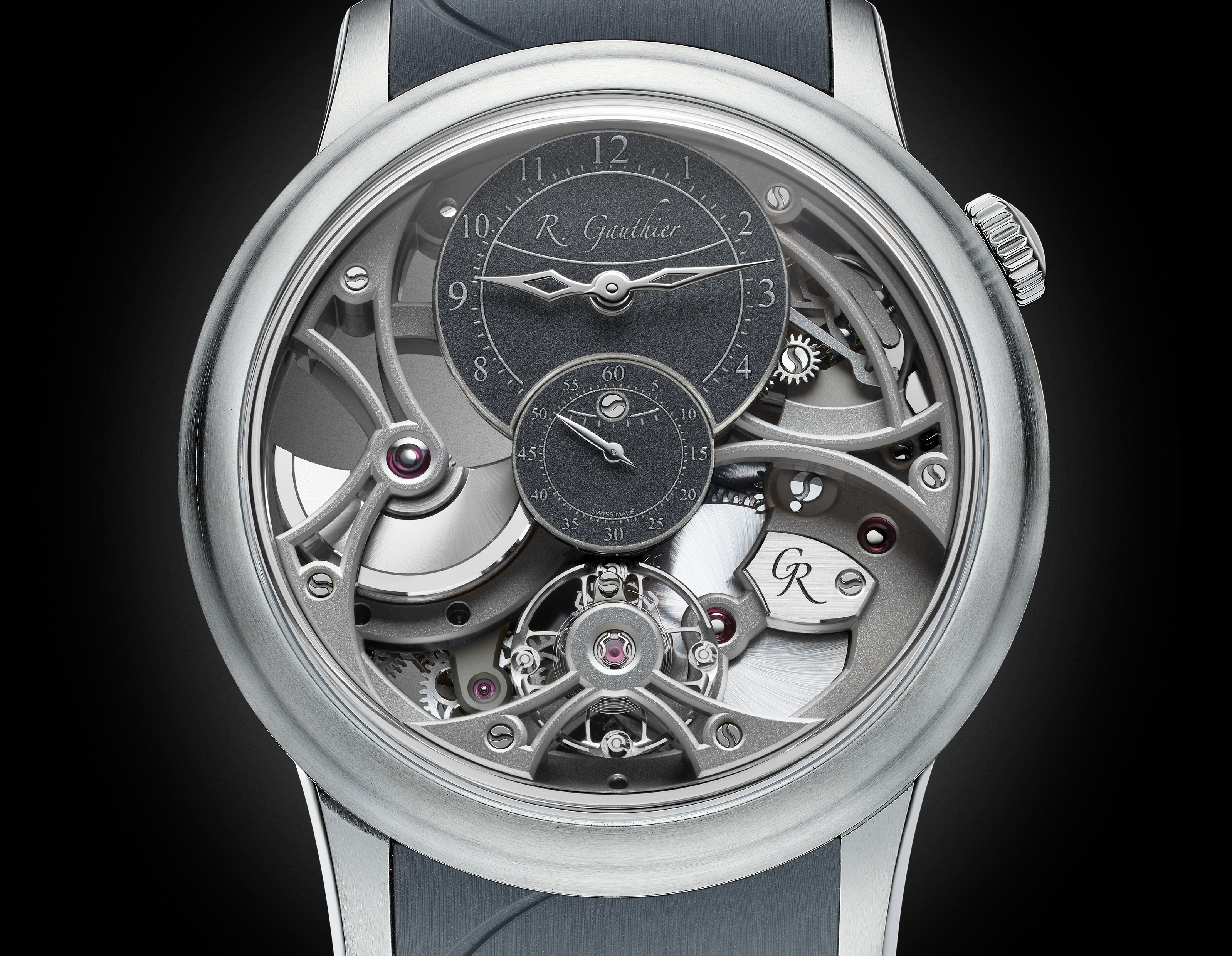 - 100 hours of superlatively hand-finishing, matte skeletonised mainplate and bridges in natural titanium